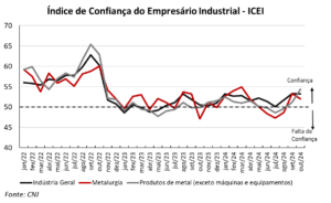 O Índice de Confiança do Empresário Industrial (ICEI), elaborado pela Confederação Nacional das Indústrias (CNI), apresentou comportamentos divergentes, para os dois setores nos quais se