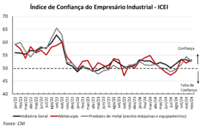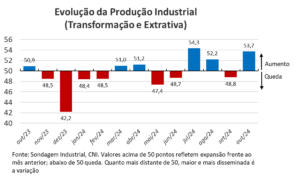 Os resultados da pesquisa Sondagem Industrial da Confederação Nacional das Indústrias (CNI) para outubro de 2024 apontam avanços da produção tanto da indústria geral (transformação