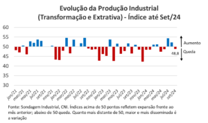 Os resultados da pesquisa Sondagem Industrial da Confederação Nacional das Indústrias (CNI) para setembro de 2024 apontam recuo da produção da indústria geral (transformação e